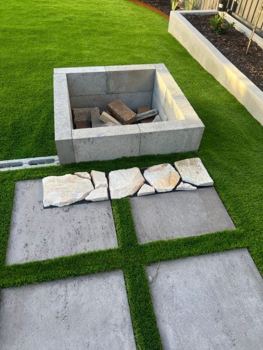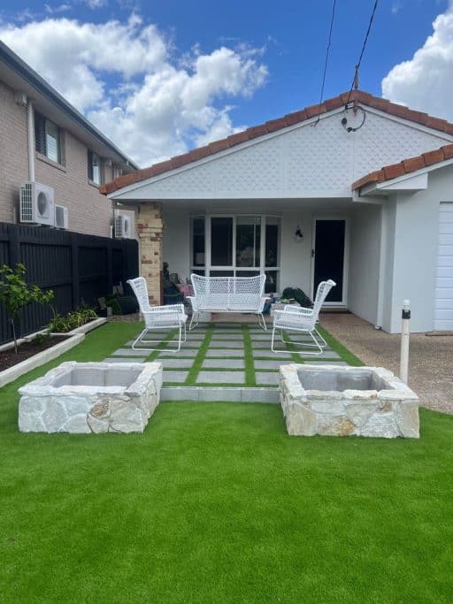 Beyond the stunning cladding, her outdoor space is a perfect blend of style and practicality. A curved garden bed edged in Corten steel, featuring three striking round planters, adds a sculptural touch. The side fence now pops in Monument paint with a crisp white raised garden bed, providing the perfect backdrop for lush greenery. Low-maintenance synthetic grass and a thoughtfully laid paver path make everyday living easier for the whole family, including her husband with his mobility scooter.