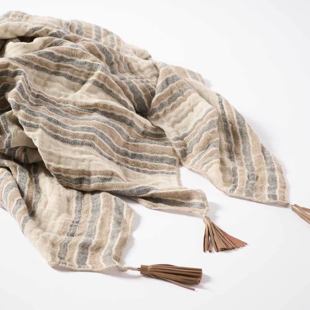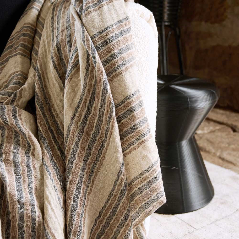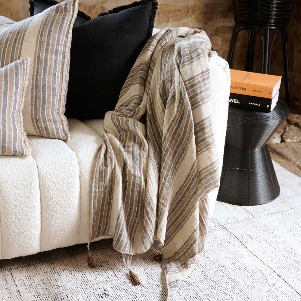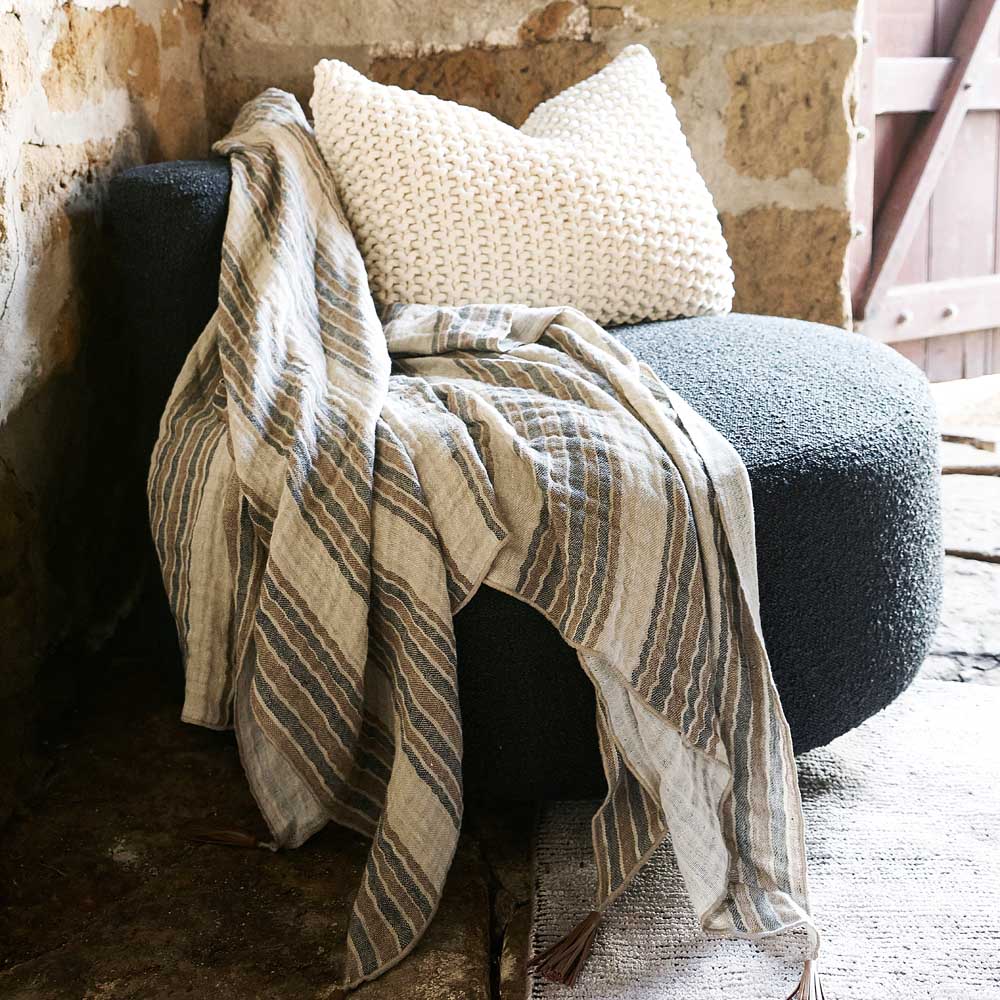 Our new Jeo linen throw showcases rust and natural tones to give an earthy mood to this versatile cushion. The ink stripe lends itself to a slate or blue colour palette and the double layer of exquisite linen adds textural appeal. Pair with the matching Jeo linen cushion for a space full of warmth and feeling.