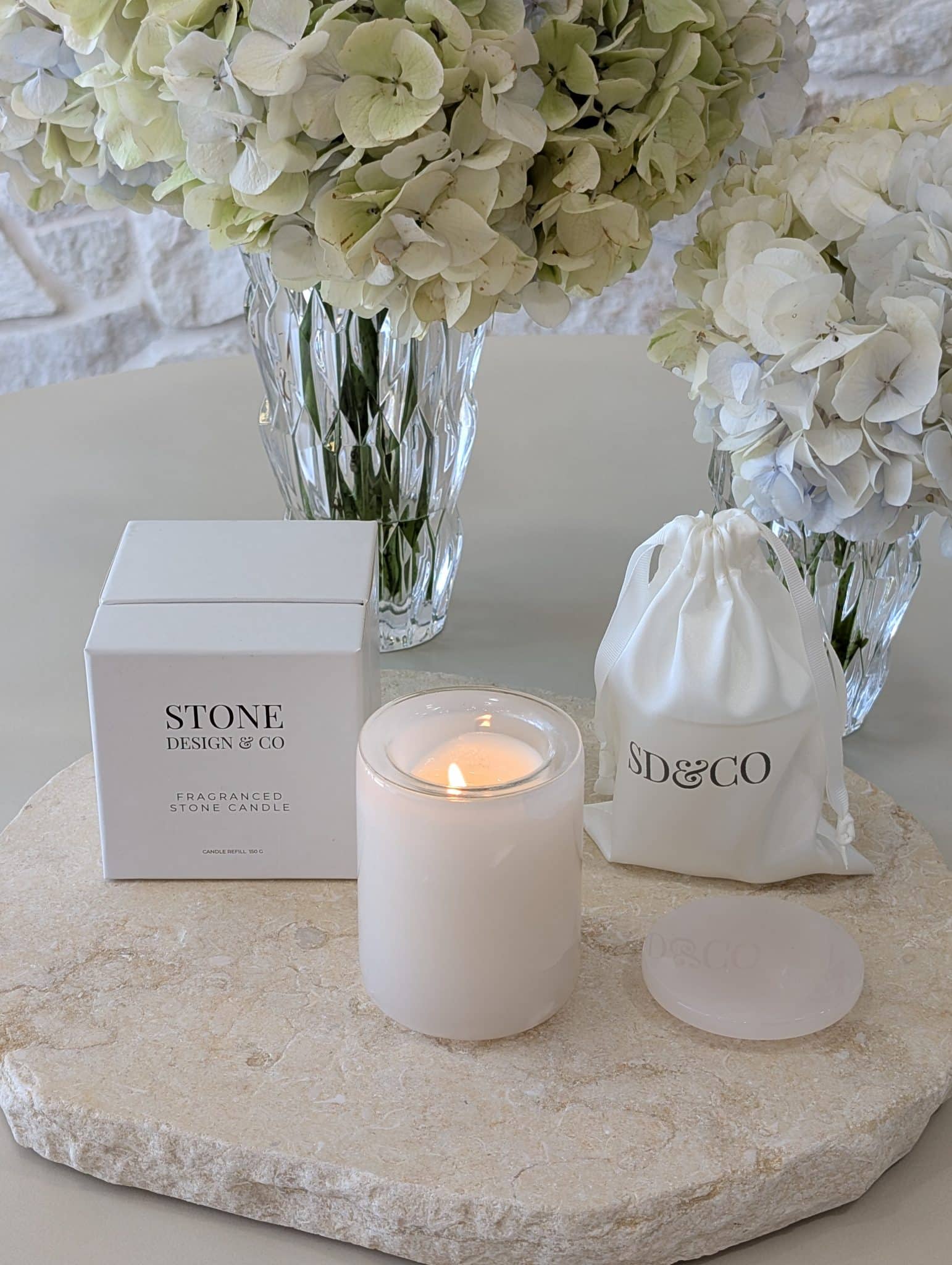 Designed and made by Stone Design & Co, our refillable stone candle is a considered expression of craftsmanship and longevity. Each candle is made to order using traditional candle-making techniques, ensuring a fresh, balanced scent throw and an optimal burn life. The refillable insert is designed to sit seamlessly within the stone vessel, allowing it to be enjoyed and refilled time and time again. Both sculptural and sensory, the candle is an elevated addition to the home or a thoughtful, enduring gift.