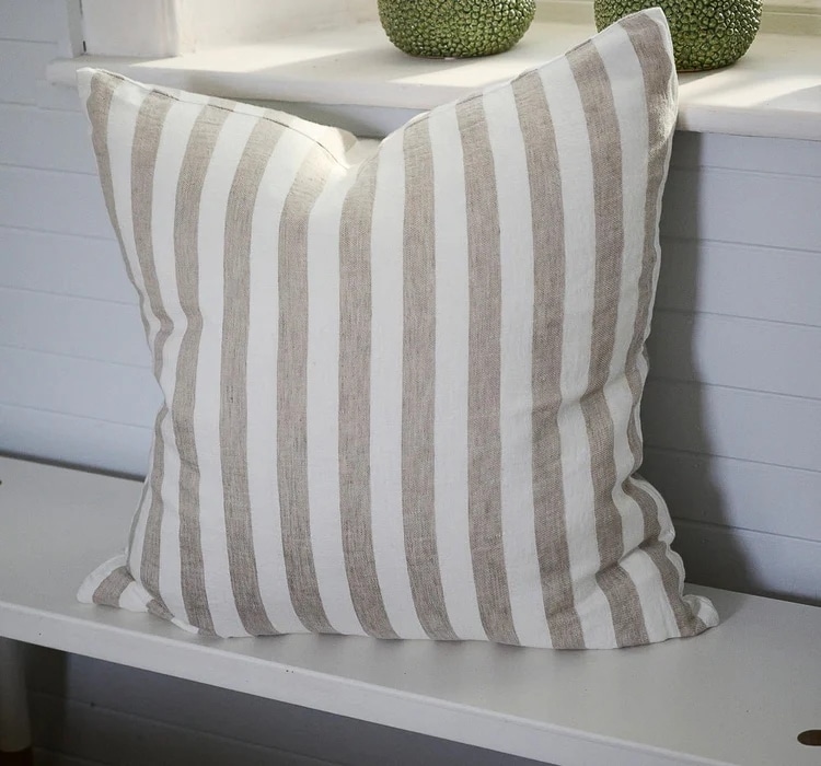 Our newest signature style, the Santi linen cushion, celebrates clean lines and statement appeal. We have reimagined the classic wide stripe tailoring it to the unique aesthetic of Eadie. Whilst the Santi stripe is bold, the yarn dyed fabric softens the stripe to create the ideal hue.