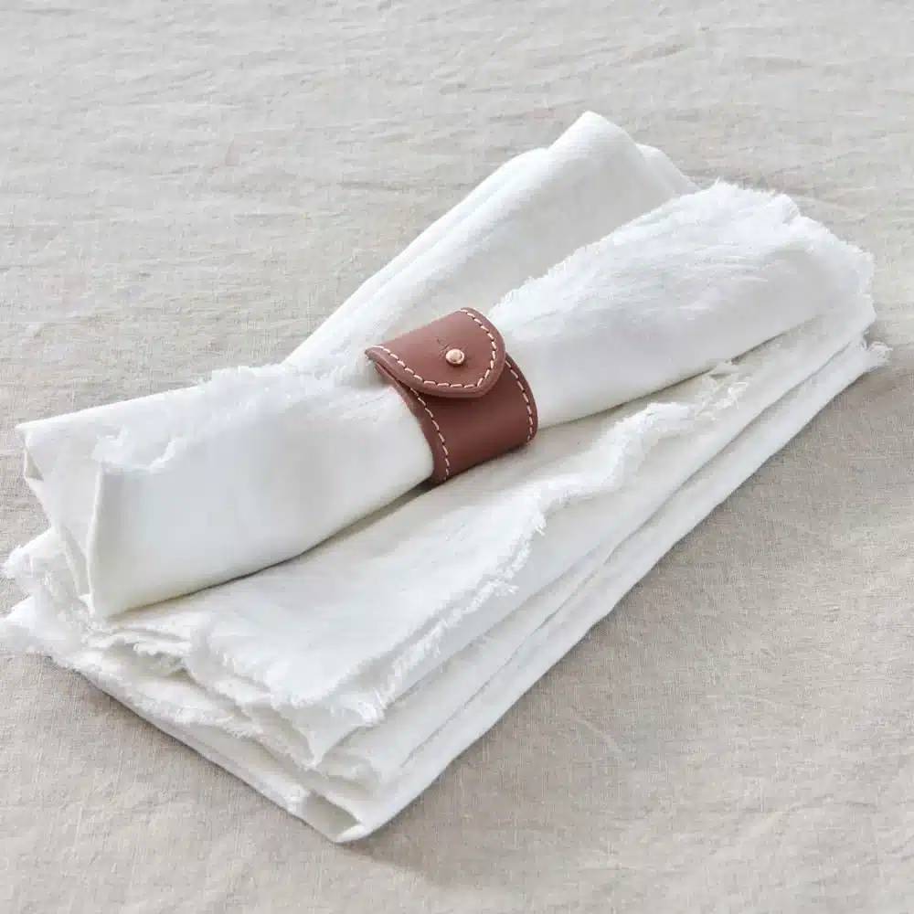 Crafted from the finest soft tan leather, our stylish Leather Napkin Rings will elevate your dining experience. Featuring a brass closure, pair with our Linen Napkins and Linen Tablecloths. Sold as a set of four. Linen napkins sold separately.